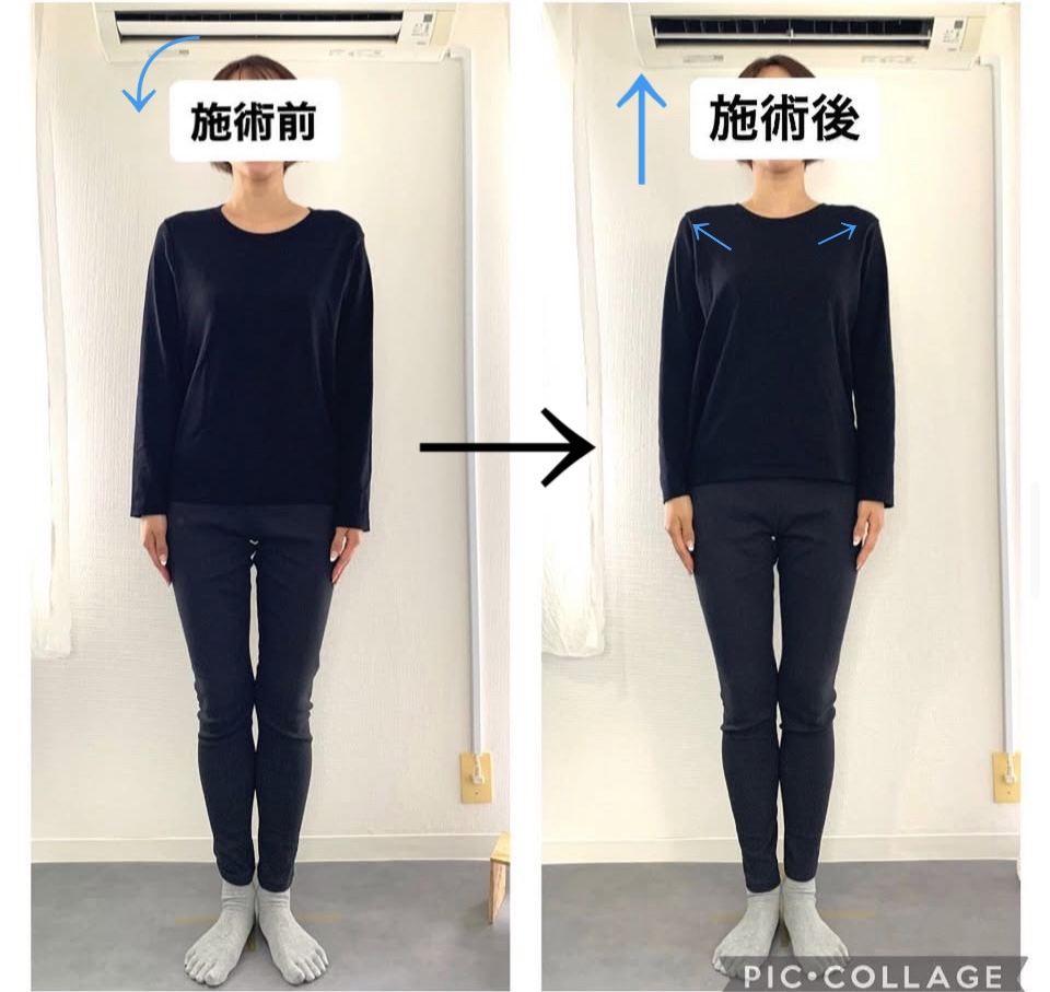 猫背で姿勢が悪くなり、胸の位置が下がり、肋骨が開いてお腹もぽっこりしていたお身体が、猫背改善してバストアップ、肋骨がしまりお腹もスッキリしました。